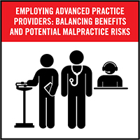 Practices and hospitals that employ advanced practice providers (APPs), including nurse practitioners and physician assistants, can experience many benefits, such as lower operating overhead, increased physician time with patients, and improved patient education and satisfaction. However, employers of APPs should consider implementing effective risk management measures to help ensure that the benefits of using APPs are not at the expense of increased liability exposure.