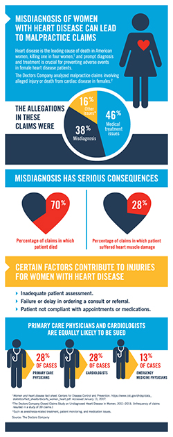 In a study of closed medical malpractice claims involving undiagnosed heart disease in women from 2011 to 2015, The Doctors Company found that in 70 percent of claims the patient died when her heart condition was not correctly diagnosed and 28 percent had heart muscle damage from myocardial infarction.