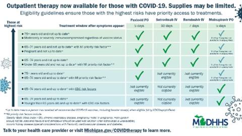 Although Michigan has received additional courses of the medications, Priority Eligibility Criteria for therapeutics, including antiviral medication and monoclonal antibody therapy, will remain in effect until the limited supply is able to meet demand and will be periodically reviewed as appropriate.