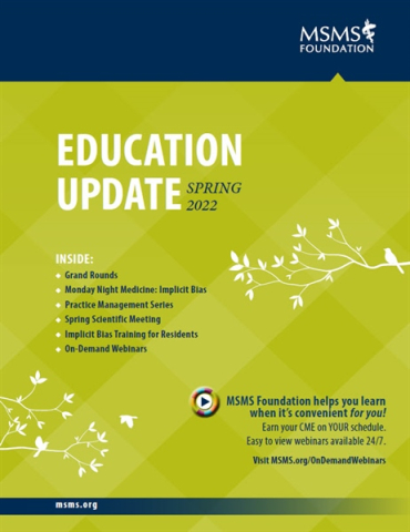 The MSMS Foundation Spring 2022 Schedule is now available. The calendar includes seven Grand Rounds programs, a new free webinar series on Practice Management with five sessions, two Implicit Bias Training sessions for residents, two Monday Night Medicine programs on Implicit Bias Training, and six courses with the Spring Scientific Meeting. In total, there are over 35 credits of live virtual CME available this spring. The 2022 Spring Education Update features the full activity details and registration information. To register, please visit our calendar of events>>