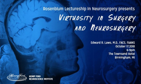 Henry Ford Neuroscience Institute will host Virtuosity in Surgery and Neurosurgery presented by neurosurgeon Edward R. Laws, MD, on Wednesday, October 17 from 6-9 pm at the Townsend Hotel in Birmingham. Doctor Law is the surgical director of Boston's Brigham and Women's Hospital Pituitary/Neuroendocrine Center and an active member of the Neuro-Oncology group at the Brigham and Dana-Farber Cancer Center. This free CME course for 1.5 AMA PRA Category 1 Credits™ is part of the Rosenblum Lectureship in Neurosurgery and is intended for neurosurgeons, endocrinologists and ENT specialists. Pre-registration required; register online or call 313-916-8354.